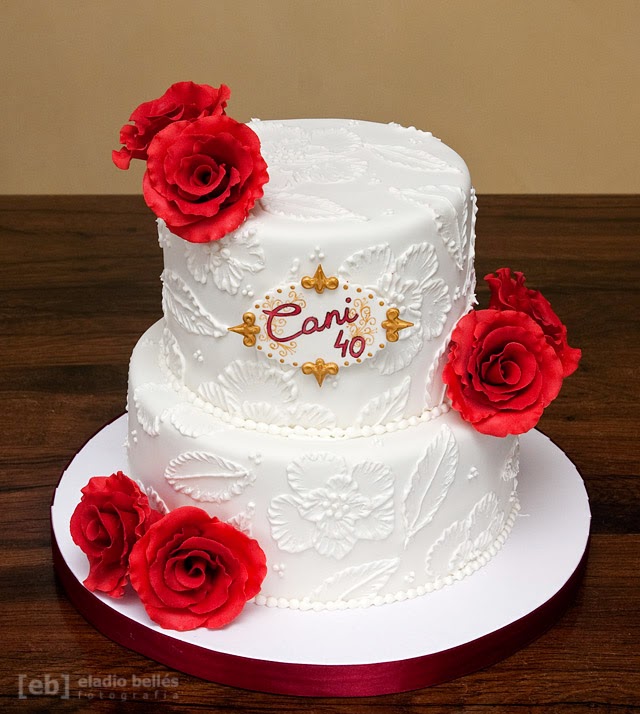 Otra de las tartas de las pasadas semanas nos la encargaron para la celebración del aniversario de Cani. Para ella nos pidieron una tarta de dos pisos, (tarta pequeña y mini), ambos con bizcocho relleno de chocolate y crema de vainilla, con una decoración sencilla en color blanco, con estampado floral y rosas rojas. Así es como nos quedó: